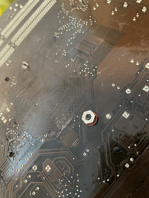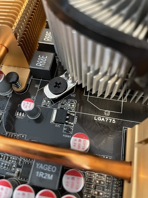A CPU hűtőjének az egyik lefogatója csavarral lett helyettesítve, a rögzítéshez pedig kerámia alátét lett használva. - lásd a fotókon
