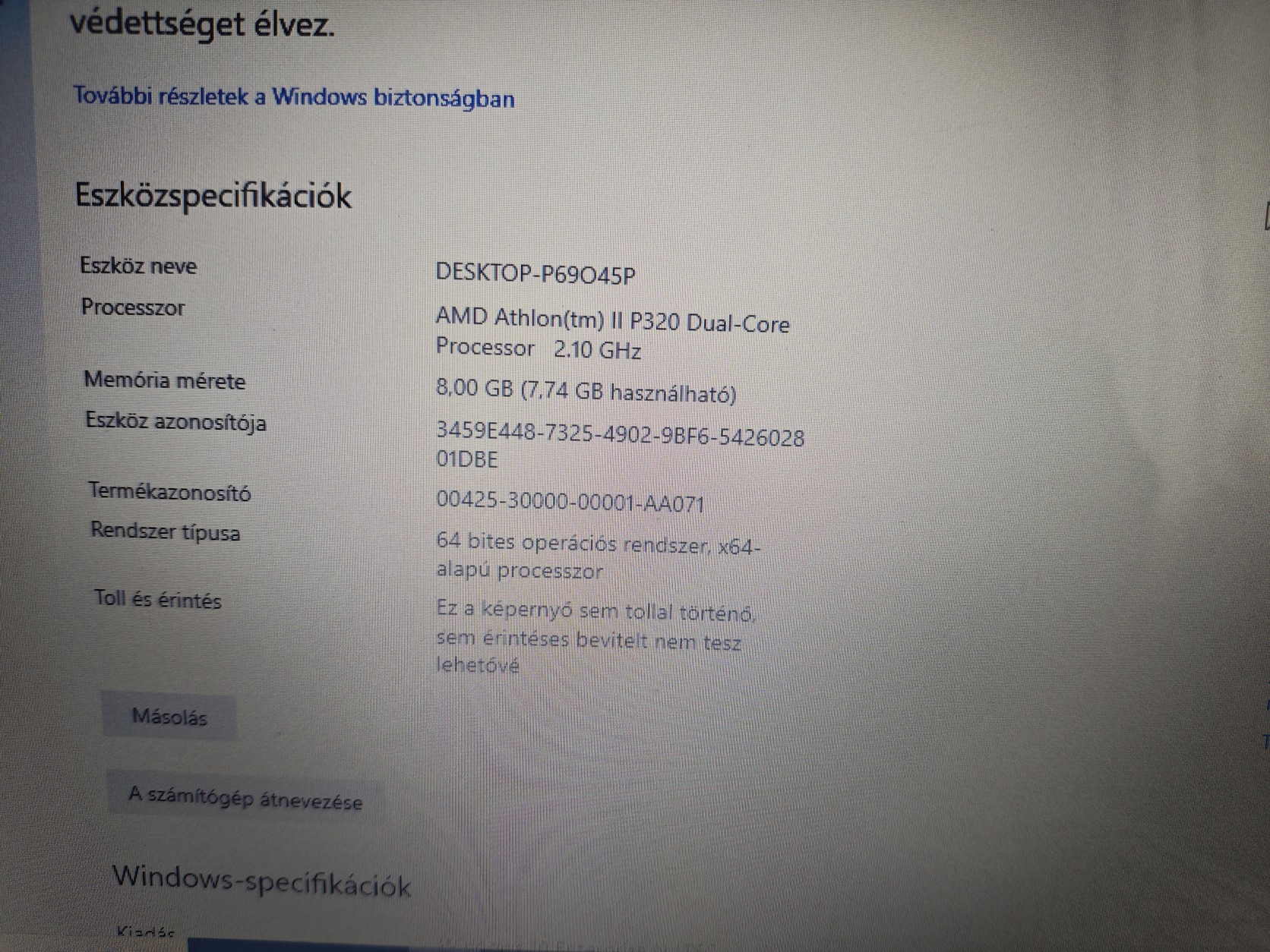 Amd Athlon II X2P320, Ati Radeon HD 4250, 500Gb hdd, 8Gb ddr3 ram.