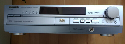 Panasonic SA-HT70 típusú, 5.1-es komplett házimozi szett. 5 lemezes dvd váltós, Dolbydigital, Dolby Prologic tudással. Teljesítmény: 5x36 + 1x120 W. Külön sub meghajtás, erősítés, nem igényel aktív sub-ot. Erőteljes hangzás. Egy megfelelő TV-vel ill. projektorral párosítva komoly moziélményt varázsol a nappaliba. A zenék a rádióból és a koncert dvd-kről egyaránt szépen, erőteljesen szólalnak meg. Nem a legújabb darab, de kiválóan működik. Minden eredeti tartozéka megvan.