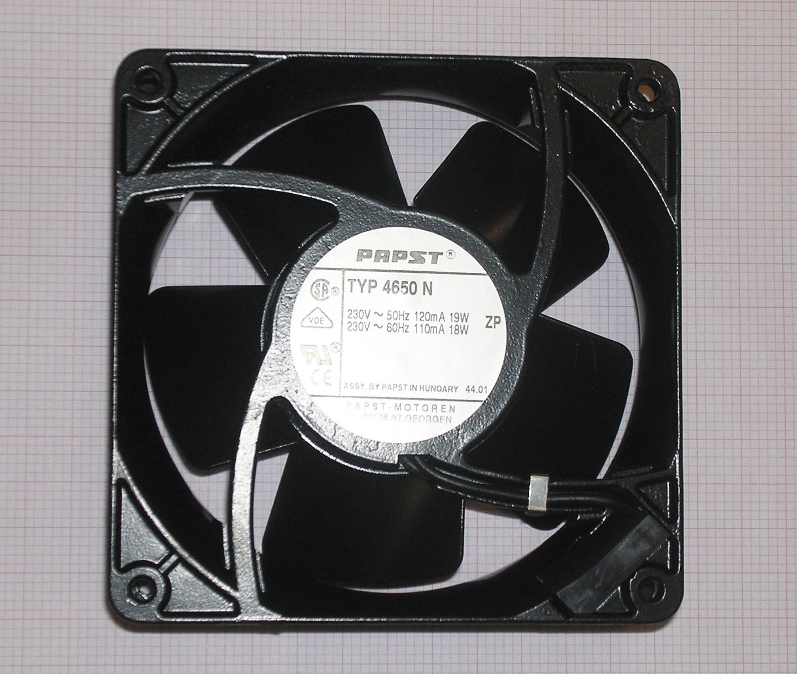 5 lapátos,120×120 mm méretű, teljesen fémből készült, 230 V 19 W-os Papst ventilátor, ahogy a képeken látható. Új.