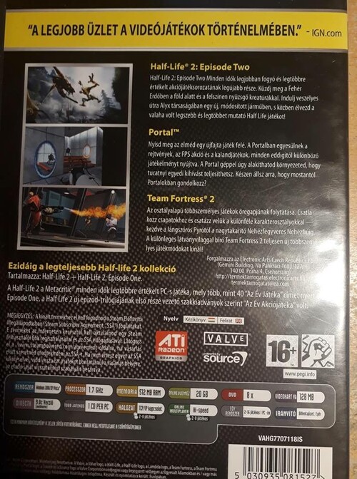 Eladásra bocsátom az egyik legkedvesebb darabot a gyűjteményemből. The Orange Box-ot. Ez a pakk öt játékot tartalmaz: Half-Life 2,Half-life 2:episode 1,Half-life 2:Episode 2,portal, team fortress 2. Félreértés ne essék a kód nyilvánvalóan nem jó,viszont a lemezek szinte hibátlan állpotban vannak.Ha játszani szeretnél velük,akkor szükséged lesz egy DVD-meghajtóra. Köszönöm,hogy elolvastad a hirdetésemet és további szép napot.