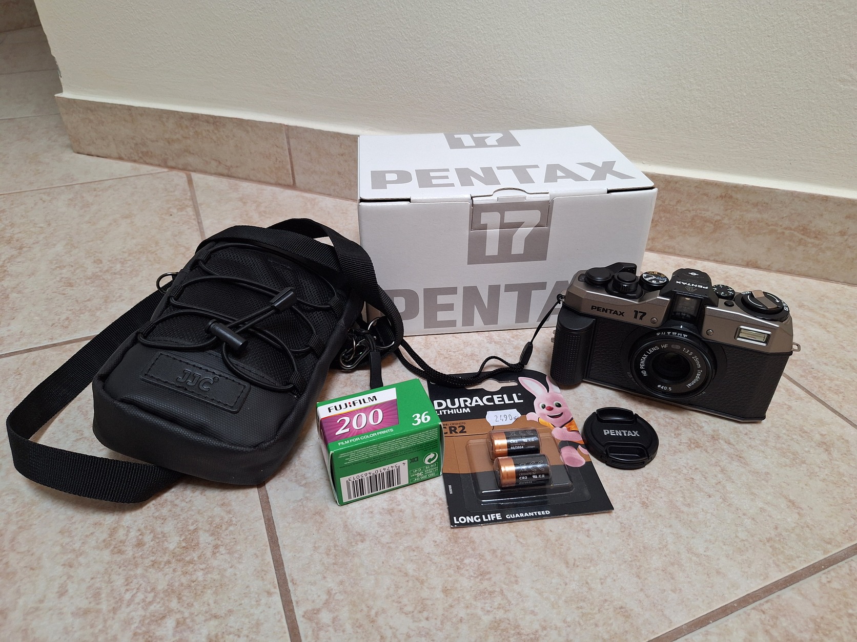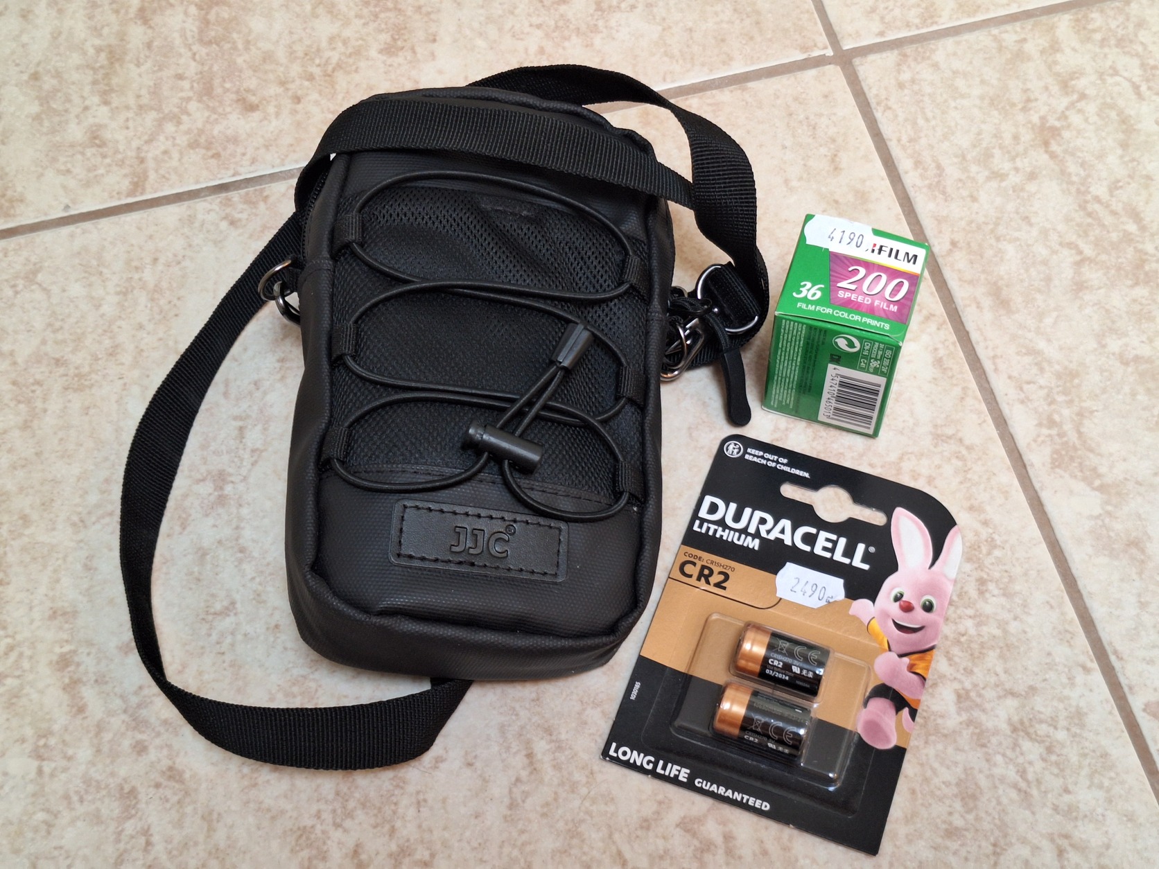 Adok hozzá 2 elemet (a gyári még benne van), egy JJC válltáskát és egy tekercs Fujifilm filmet.