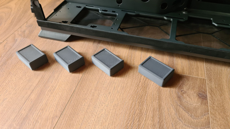 (Magasított lábak, alsó szekció így jobban szellőzik, és egy a VGA alá gyártott dupla venti konzol, ami az alsó mini itx alaplap előkészítés csavarhelyeit használja.)