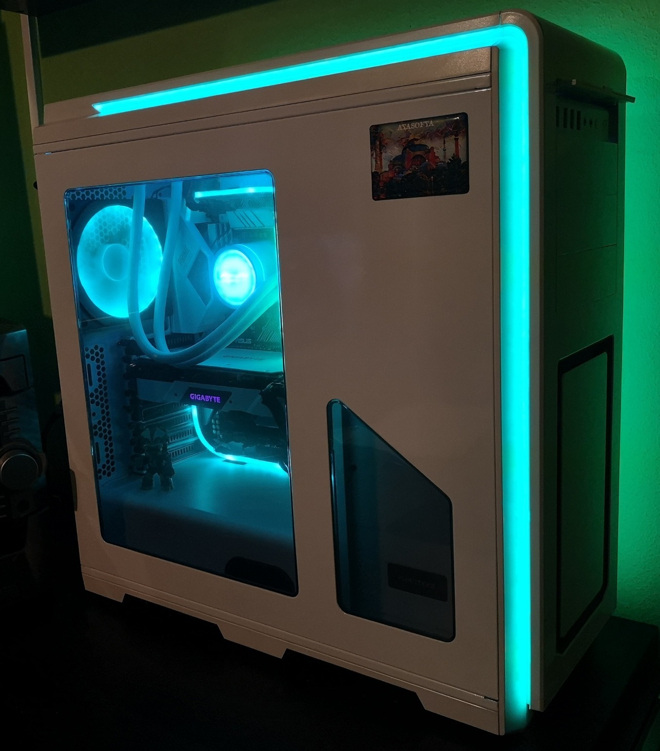 Pluszként egy Phanteks Halos D-RGB 140mm frame van még hozzá a hátsó 140mm-es ventin. (képek közt látszik miről van szó)