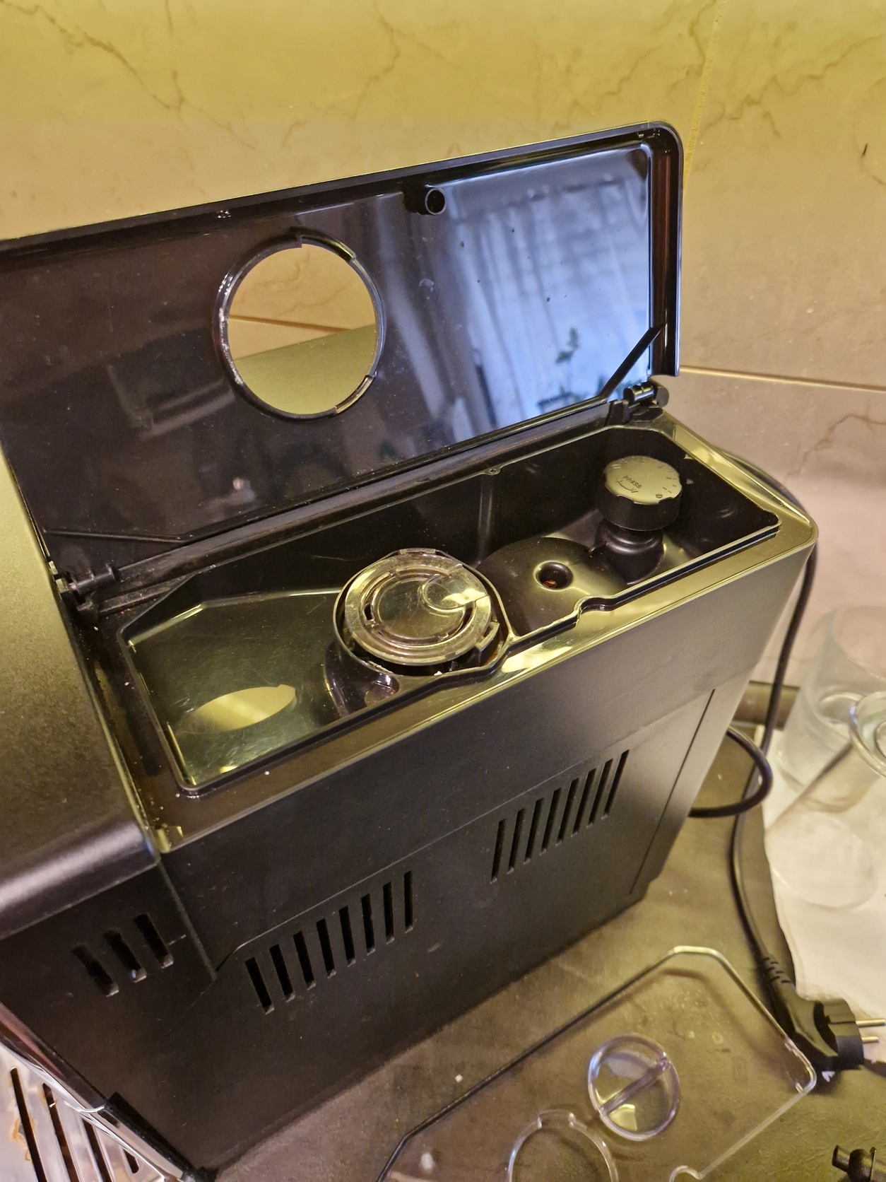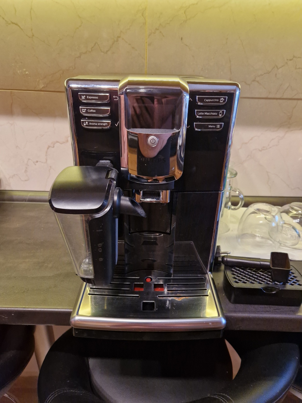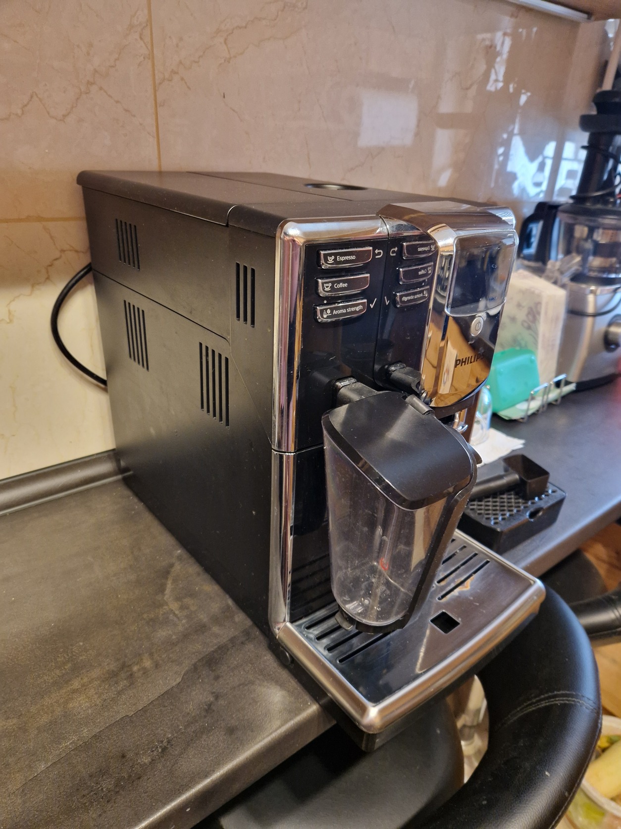 Rendszeresen takarított, jó állapotú gép, a tálcán egy kis rozsdafolltal, jól működő automata tejhabosítóval.