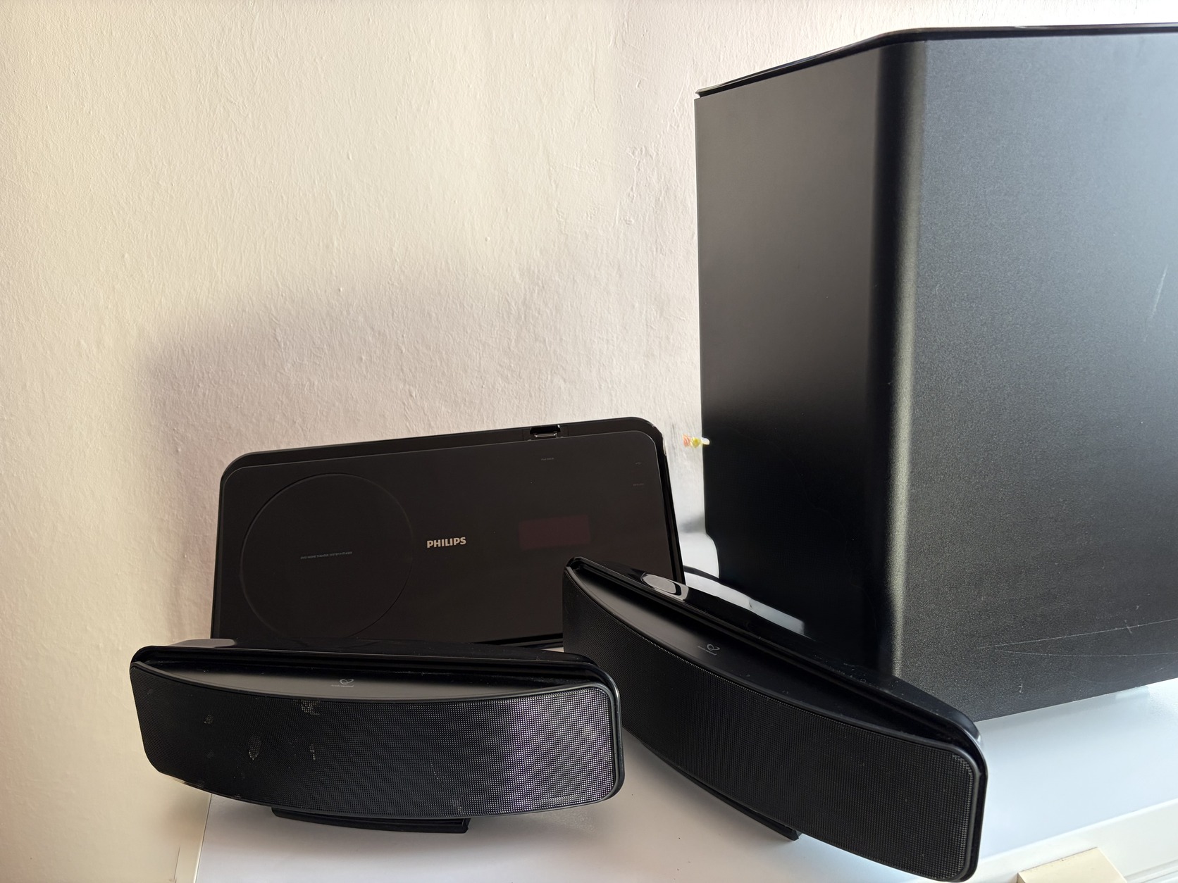Sziasztok eladó Philips Házimozi rendszerem, 2.1 gyönyörűen szól,150w a mélyláda, hibái: bekapcsoláskor valamikor zúg és pattog, de valamikor nem csinálja, kondi hibája lehet egy szerelő szerint, nem foglalkoztam vele inkább vettem egy újat, a kezelő panel Érintőkijelzős, iPod dokkolós, USB csatlakozós, az árát hibájának megfelelően lőttem be