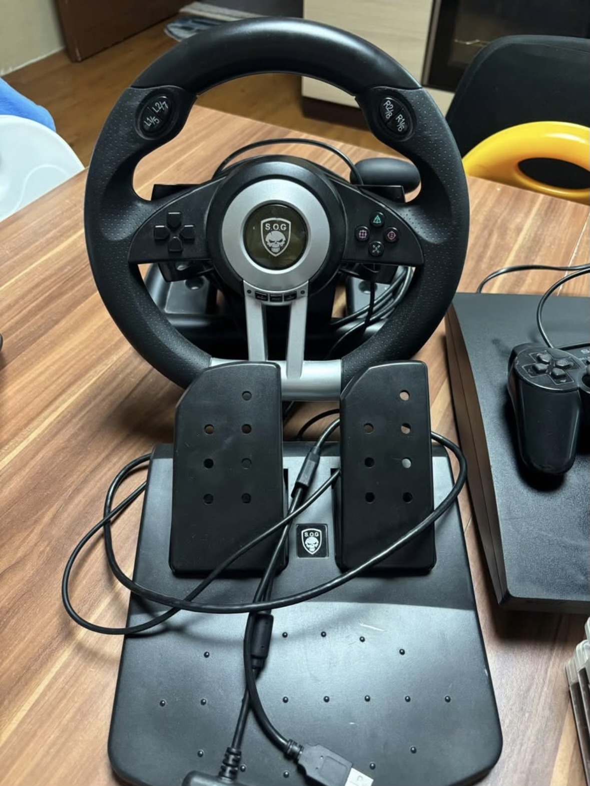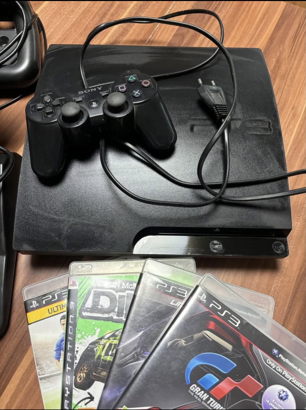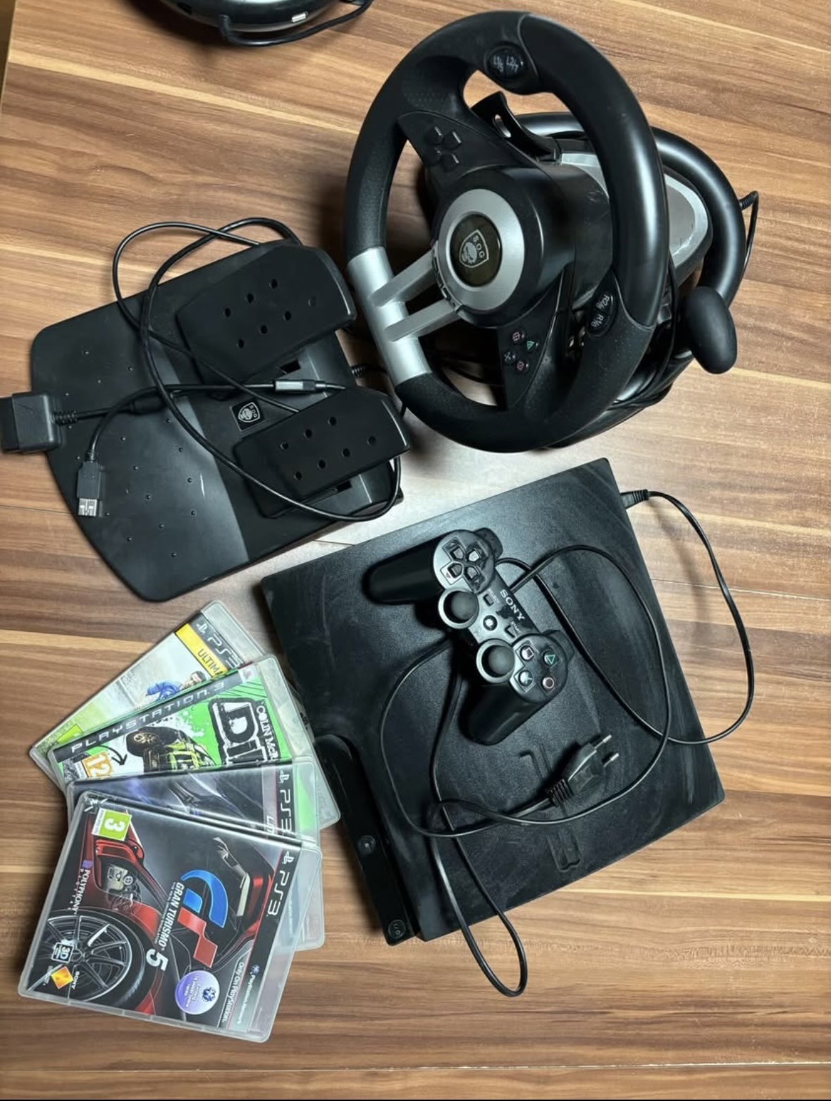 Eladó egy komplett ps3 szett, kormány,pedál, 2db kontroller egy eredeti és egy vezetékes utángyártott kontroller, 5db játékkal