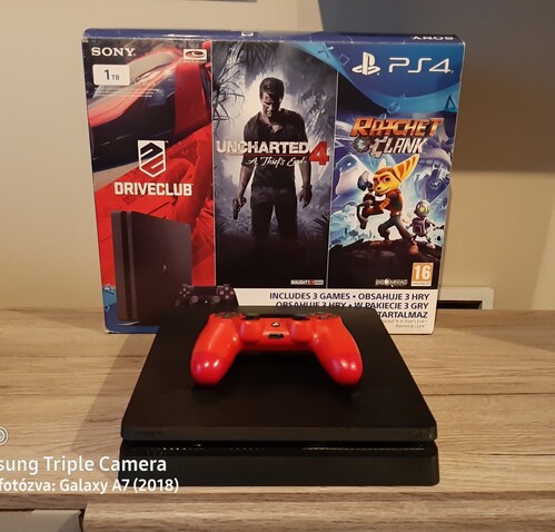 Képek szerinti kifogástalan műszaki és esztétikai állapotban eladó PS4 Slim 1tb tárhellyel, 1db piros joy-al és egy Uncharted4 lemezes játékkal.