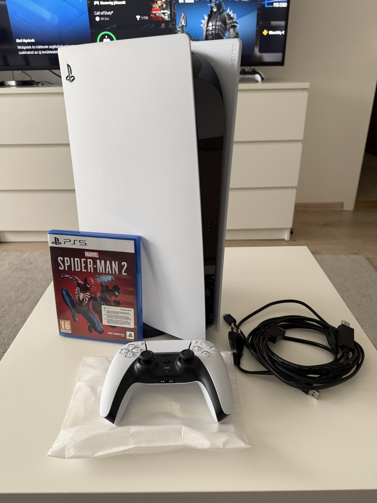 Eladó a képen látható szeretet Playstation 5 sima (Fat) lemezes konzol, minden tartozékával és dobozával. Eladás oka Pro-ra váltás miatt. Teljesen tökéletesen működő , megkímélt, szépen használt, hibátlan állapotú PS5, ahogy a képen is látszik , van hozzá egy Spider-man 2 játék, és egy teljesen új , be se kapcsolt kontroller amit a Pro géphez kaptam. Nekem van kettő saját kontroller,így nincs szükségem erre az újra. Helyileg Békéscsabán át vehető, vagy csomag küldéssel is megoldható előre utalás után.