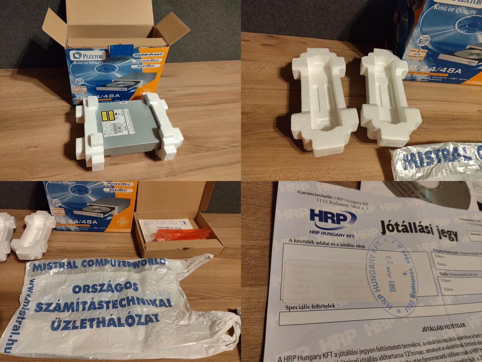 Tartozik hozzá négy hibátlan Plextor CD, valamint egy újraírható Plextor lemez, ami karcos.