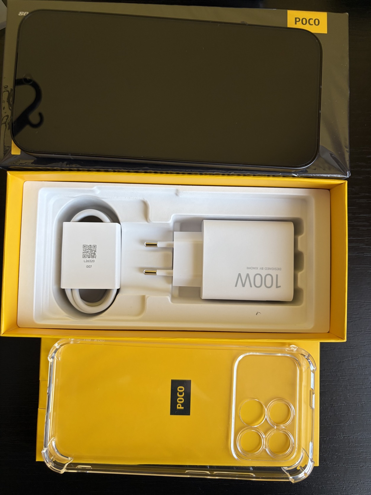 Eredeti gyári doboz, 100W-os töltőfej, töltőkábel, gyári szilikon tok, és ajándék átlátszó szilikon tok.
