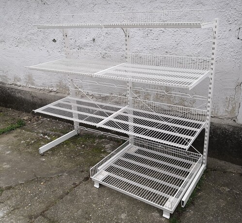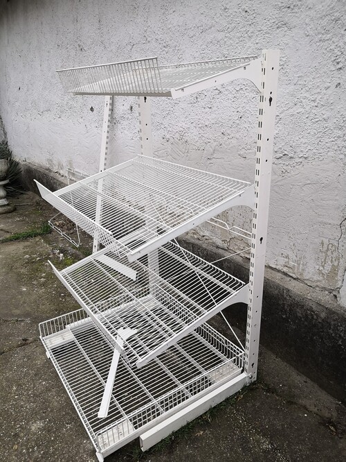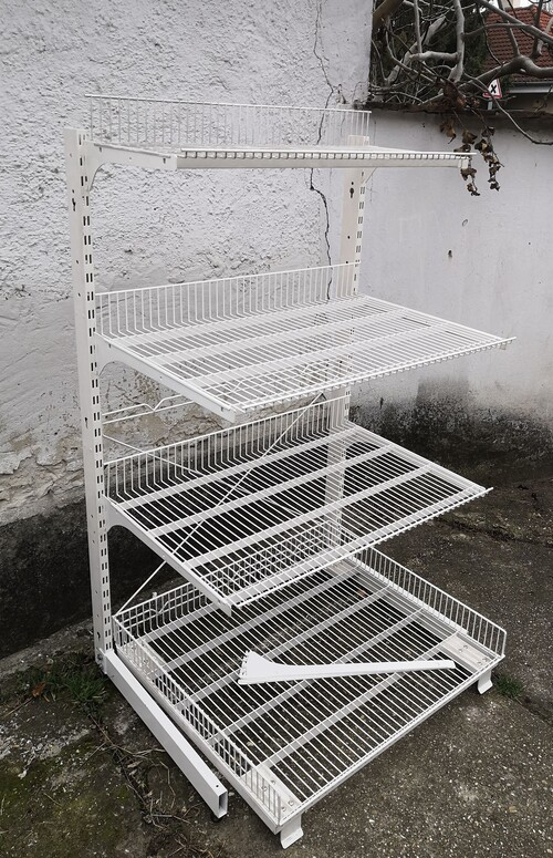 Rácsos bolti polc, polcrendszer, üzletberendezés. Fehér színben.