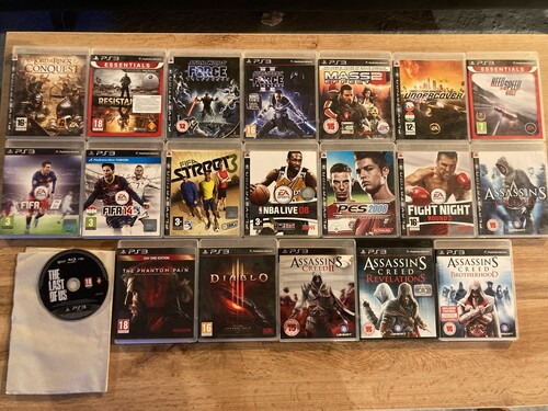 -20db játék: Last of Us - tok nélkül, Metal Gear Solid V - Phantom Pain, Diablo III, Assassin's Creed 1/2/Revelations/Brotherhood, Fifa 16/14/Street3, NBA 08, PES 08, EA Fight Night 3, Lord of the Rings Conquest, Resistance, Star Wars - The Force Unleashed 1/2, Mass Effect 2, Need for Speed Undercover/Rivals)