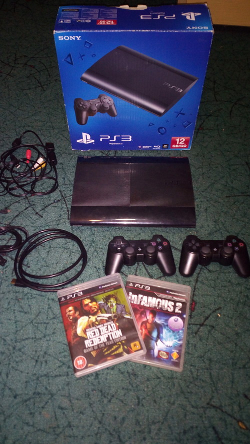 Eladó egy keveset használt PS3 Superslim 12 Gb, 2 db utángyártott vezeték nélküli kontrollerrel, és 2 db játékkal Red Dead Redemption GOTY és Infamous 2, gyári dobozában.