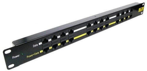 PoE injektor - rackba, passzív PoE, 12 PoE port, LED-jelző, üzemi hőmérséklet 0 - 40 °C, mérete 21,8 × 482,6 × 44,3 mm (Ma×Sz×Mé), fekete kivitel.