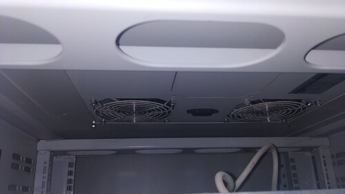 Az eleje üveg, jó állapotban van, viszont eléggé poros. 4 polc található benne, ebből három sínen, egy fix. Ezen felül egy sín található még benne. A tetején két db 120mm-es ventillátor dolgozza ki a meleget. A szekrény kerekeken áll.