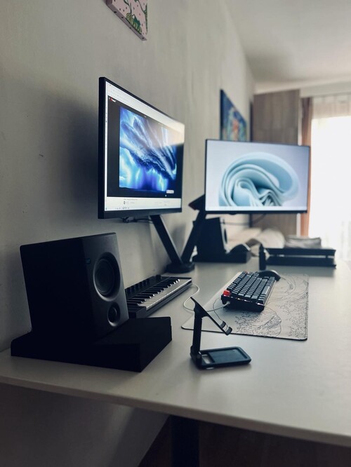 Az eszköz plug and play, nagyon gyorsan összeszerelhető, a monitorok 360 fokban fordíthatóak, illetve a kar egyedi kialakítása miatt előre, hátra, le / fel húzható elég sokáig.