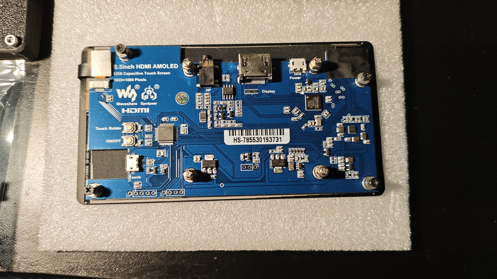 2) WaveShare WS16103 minden gyári tartozékával (5,5" AMOLED, 1080x1920p felbontás, 5 pontos kapacitív érintés, HDMI audió 3,5mm jackre, működik linux, windows alatt egyaránt) + ajándék 3D-nyomtatott ház
