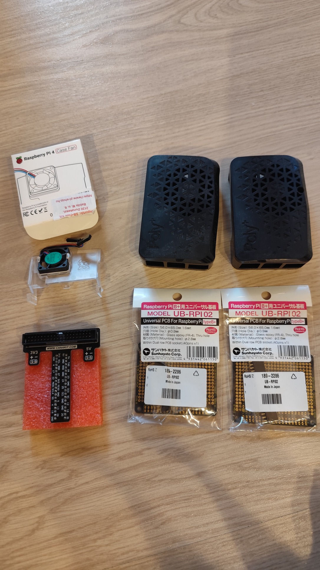 A két nyák panel pi 2 és 3 kompatibilis, a házak és a hűtőventi pi 4. Balalsó sarokban a T alakú cucchoz tartozna egy szalagkábel, sajnos nincs meg.