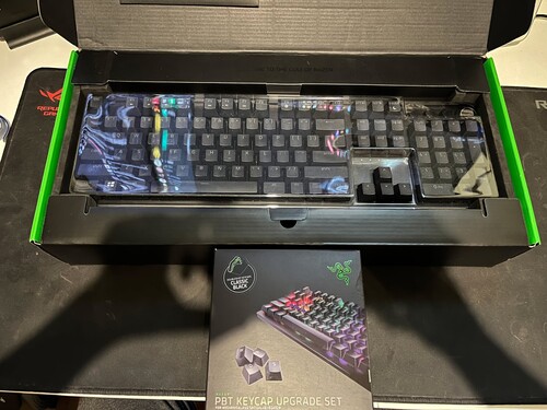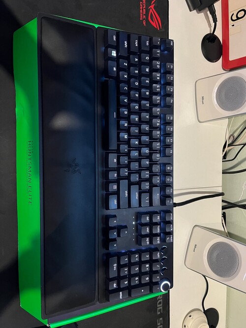 Eladó Razer Huntsman Elite gamer vezetékes billentyűzet dobozában, tartozékaival, Razer PBT upgrade settel.