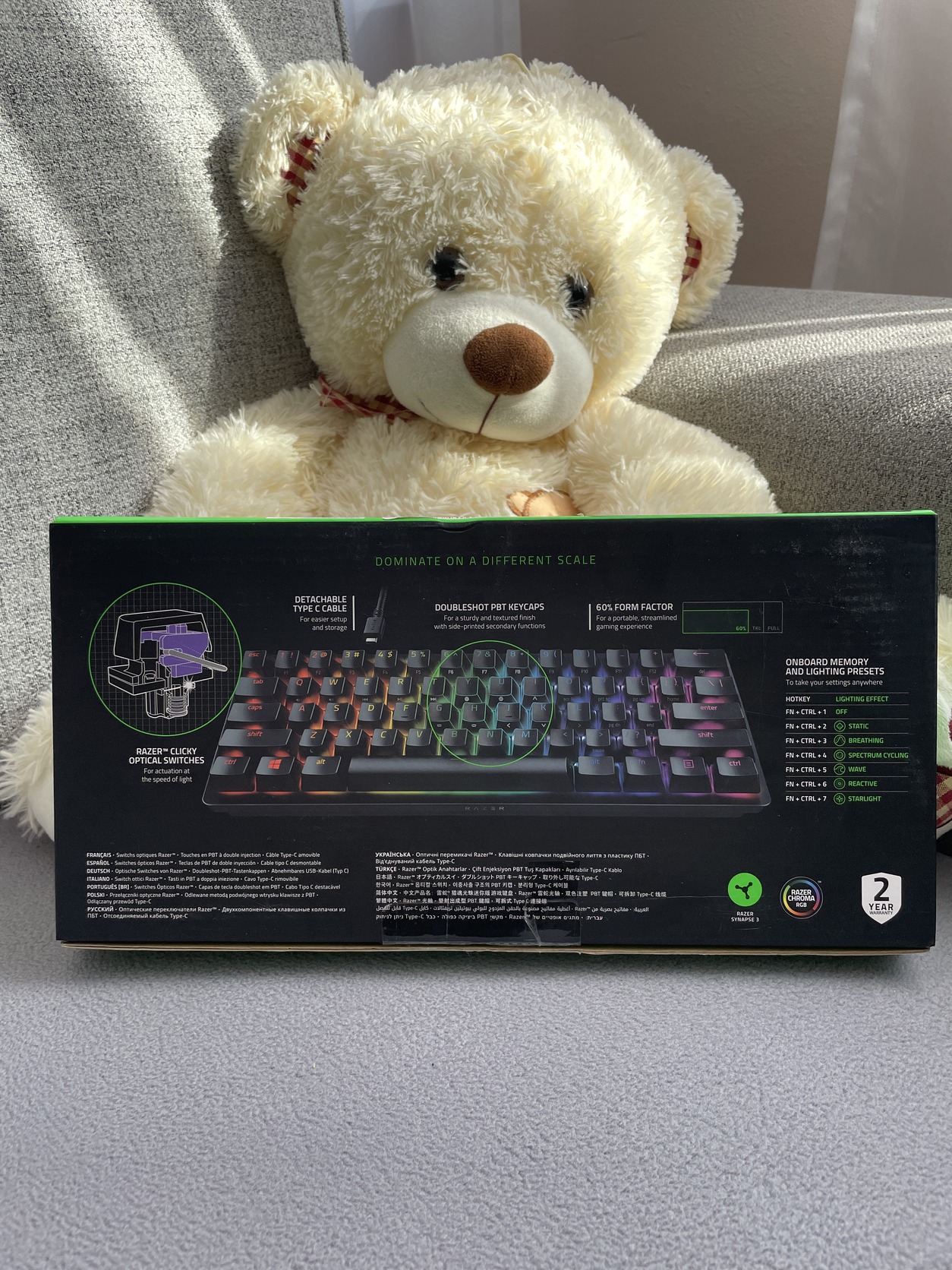 Eladóvá vált kihasználtság miatt RAZER Huntsman Mini lila switches, RGB, fekete, US Angol kiosztású 60%-os billentyűzetem.