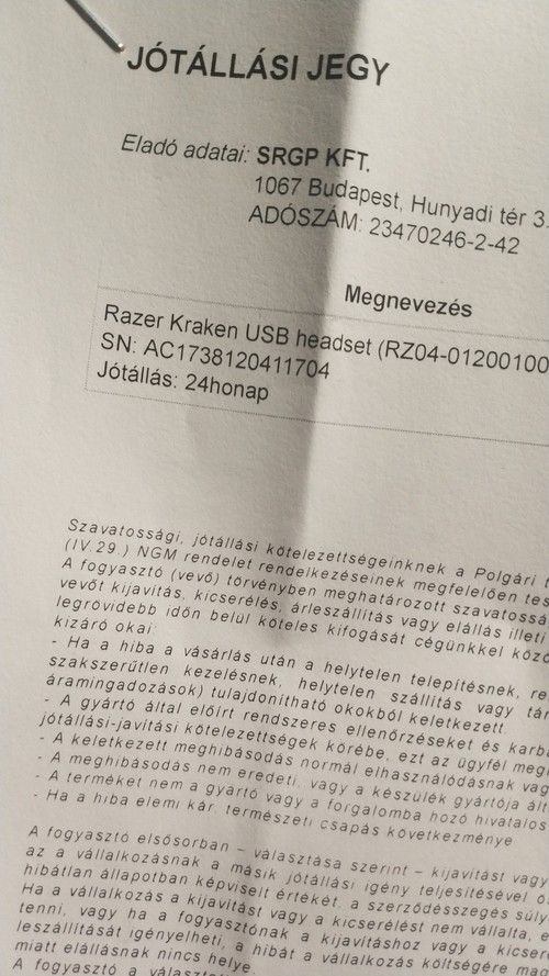 A fejhallgatóra 2019. 12. 08.ig vonatkozik garancia.