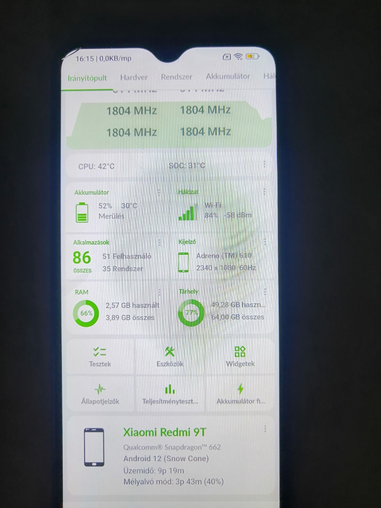 Kijelzőn hajszálrepedés, használat közben, szemből nem zavaró. Illetve 1db zöld pixelhiba csak sötét képnél.