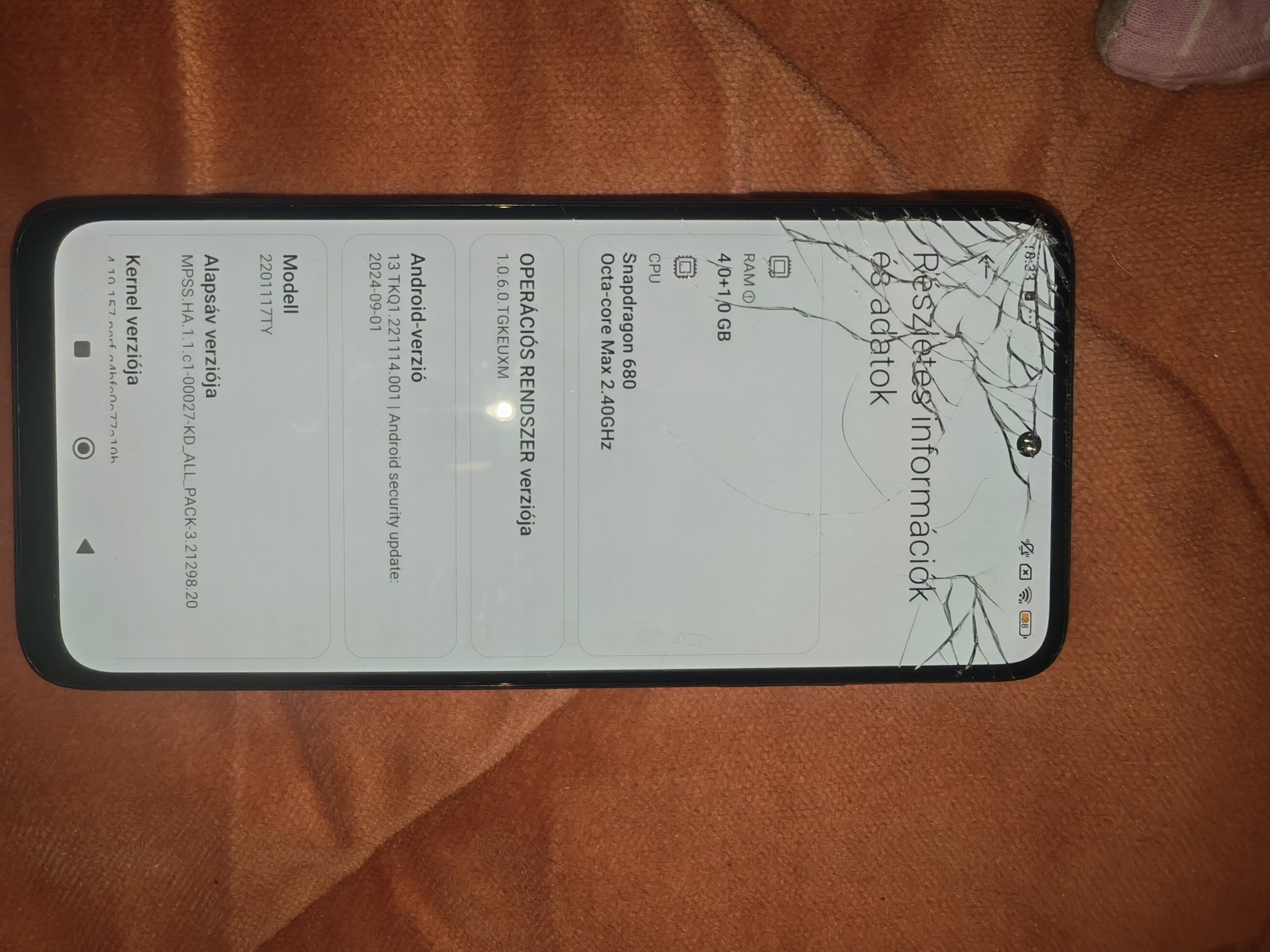 Teljesen üzemképes, kártyafüggetlen, Android 13 rendszer, ami még frissíthető, Kijelző repedt, üvegszilánk nem hullik, teljesen stabil, nem hiányzik szilánk, teljesen stabil a működése, nincs pixel, vagy fekete folt, érzékel mindenhol! Napi használtra alkalmas! Akku jó állapotú, kamera, alaplap, minden kiváló!