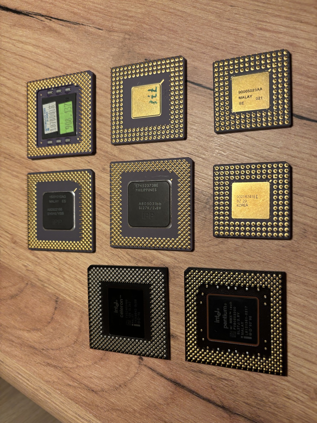 AMD 486 100 MHz A80486DX4-100SV8B - 8000 FtIntel 386 DX 33 Mhz A80386DX-33 IV - 6000 FtIntel A82385-33 IV (b) Ceramic Gold 80386 CPU Cache Controller 33mhz Pga132 - 4000 FtIBM/Cyrix 6x86L PR166+ 133 Mhz - 7000 FtIntel Celeron 400 MHz FV80524RX400128 - 2000 FtIntel Pentium MMX 200 MHz FV80503200 - 4000 Ft