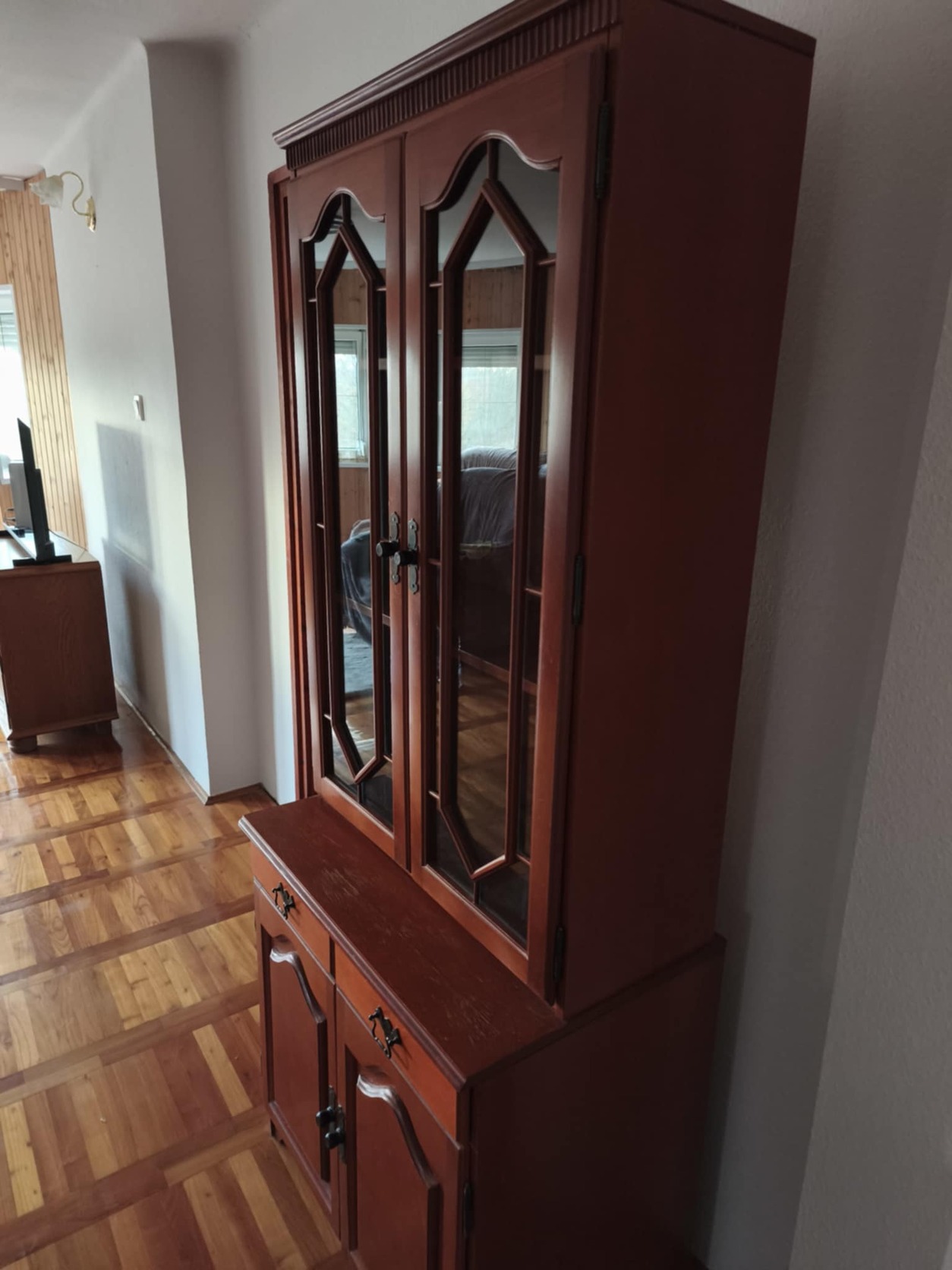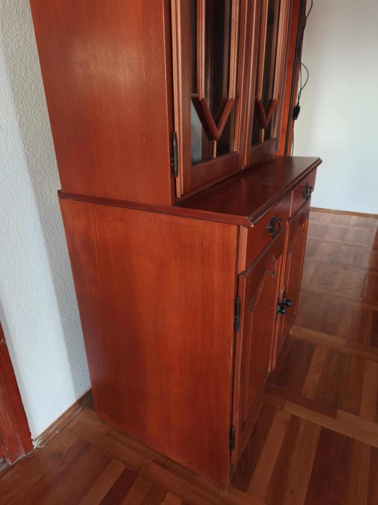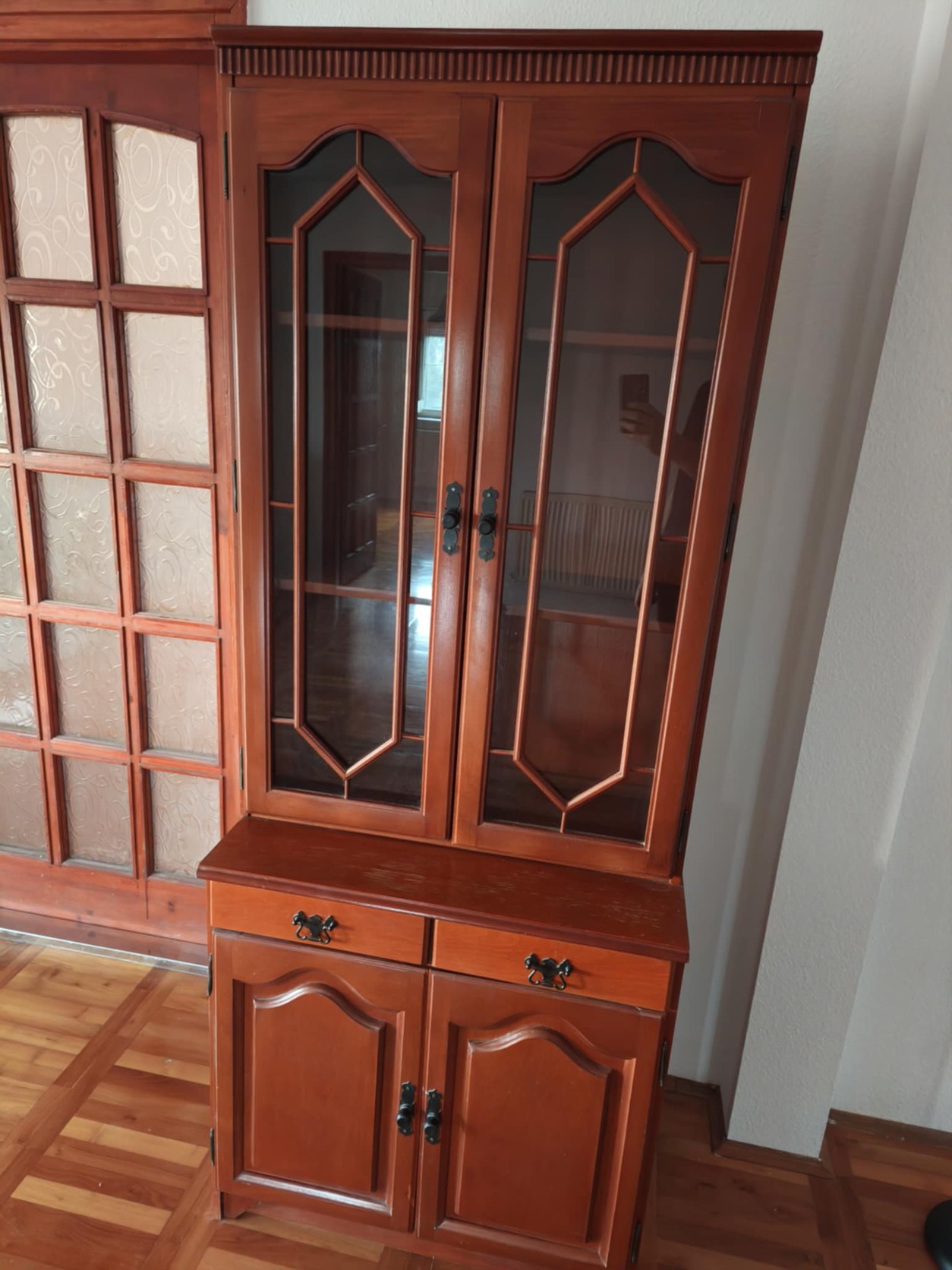 Retró tömörfa szekrény, üveges vitrin