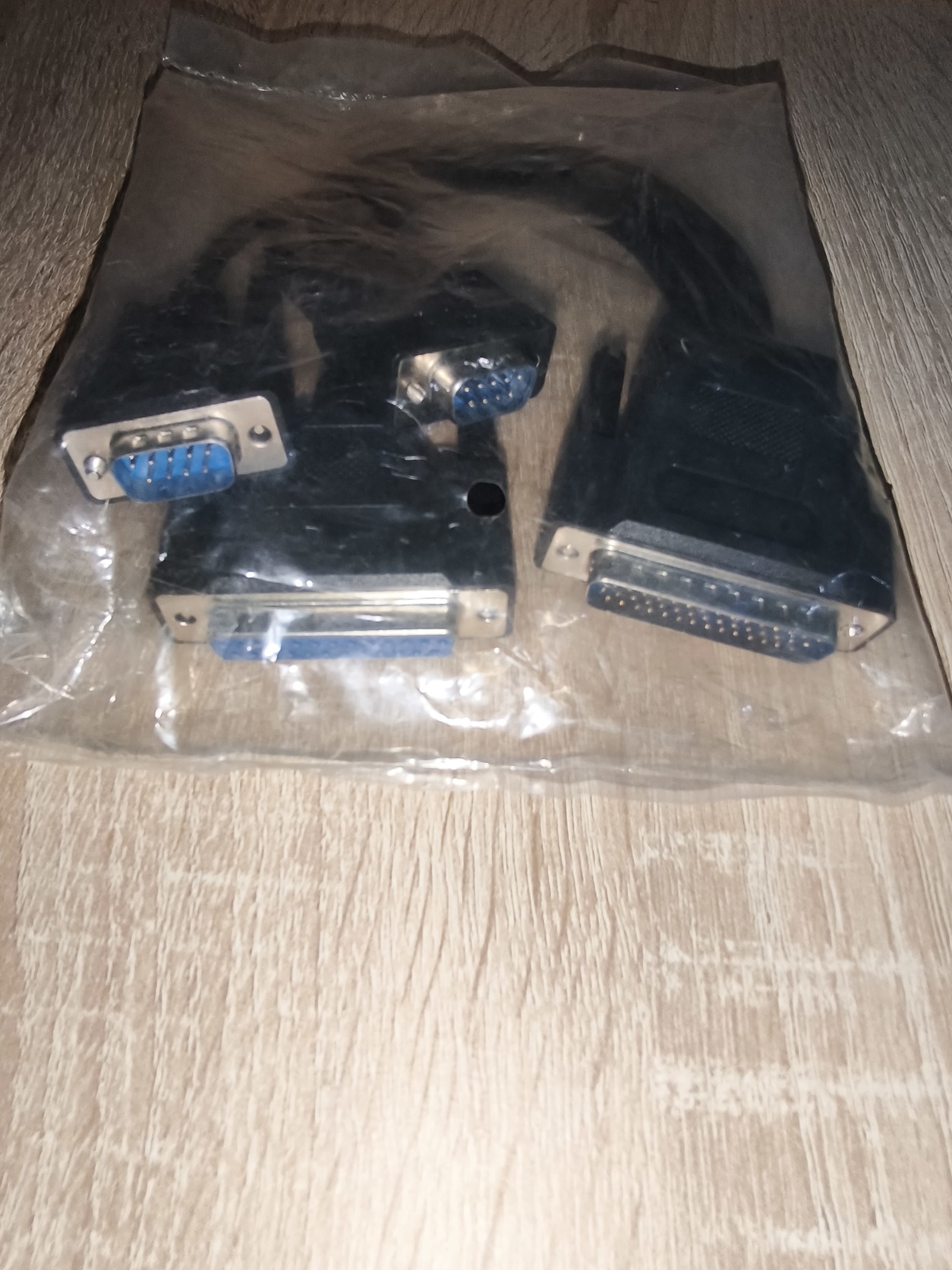 Egy nagyobb adapter DB25 (25 tűs, valószínűleg male) csatlakozóval.