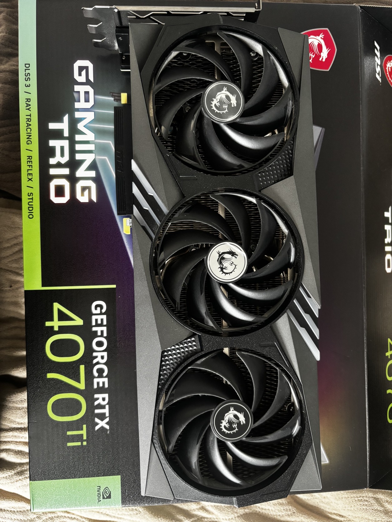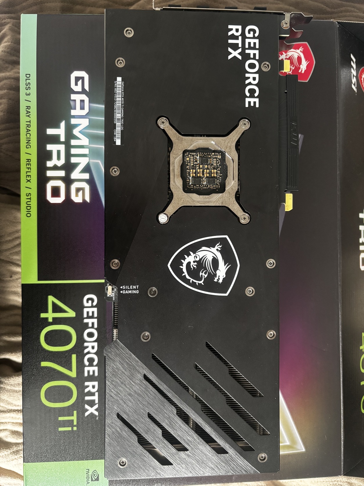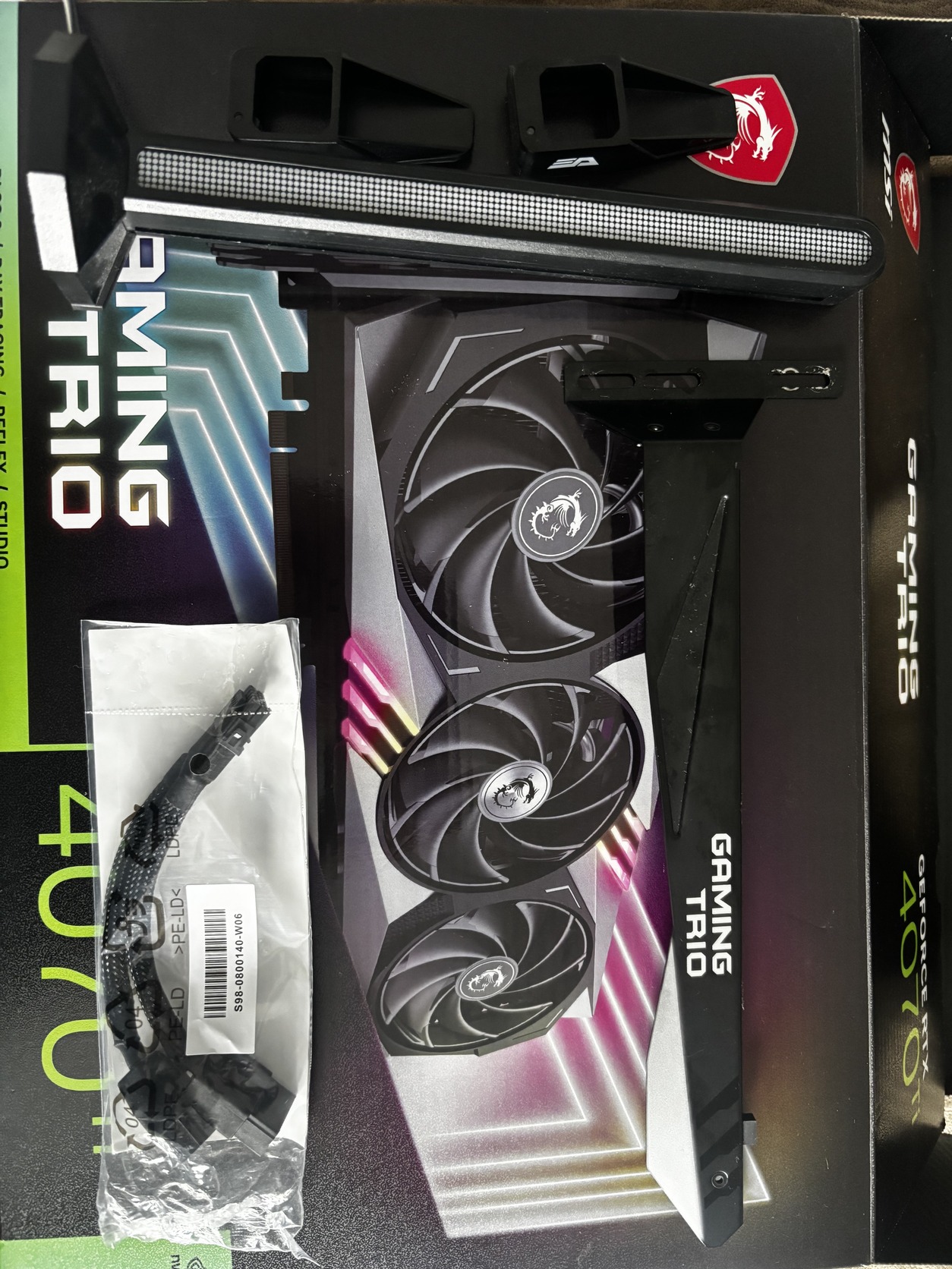 Eladó a képen látható RTX 4070ti Msi Gaming Trio egy rgb-s videókártya tartóval de az eredeti is megvan amit hozzá adnak