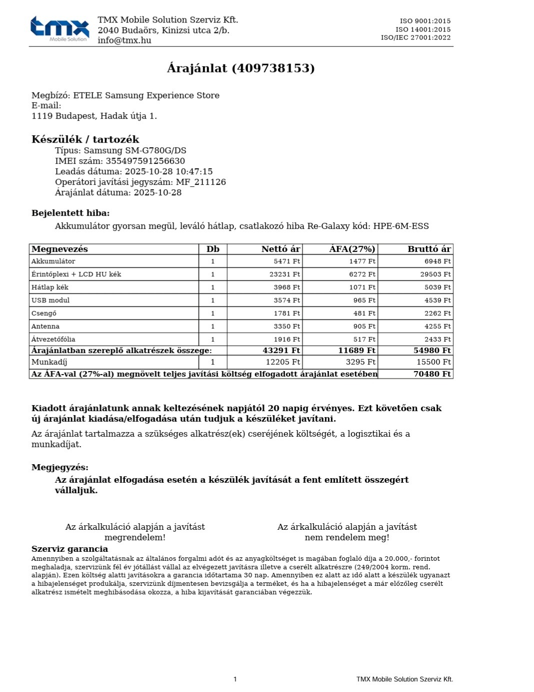 Samsung szervízpartnernél többek között akksi és usb panel cserélve.