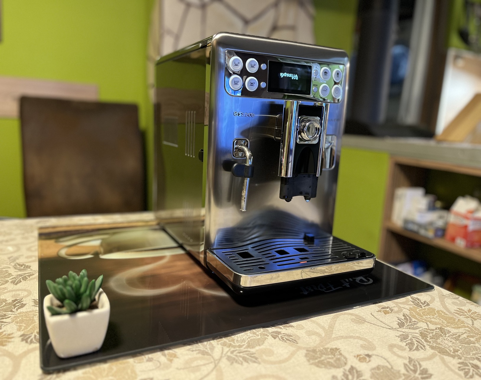 Eladó egy Saeco Exprelia EVO Inox automata kávégép – automata tejeskancsóval, frissen szervizelve, gyönyörű állapotban!