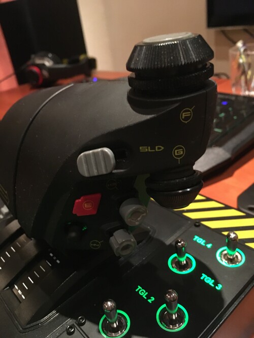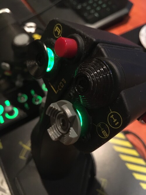 A Joystick tökéletesen működik, de sajnos a jobb alsó hat-switch (képen látható szürke) centering mechanikája hibás (eltört belül valami, talán egy pici rugó, de a gomb maga ettől még működik csak nehéz használni) .