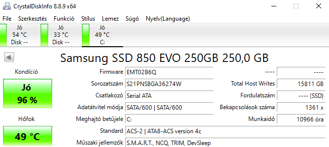 Nagyobbra váltás miatt eladnám az SSD-m. Csatoltam képet az állapotáról, igazából még közel sincs, hogy baja legyen. Gyári adatok szerint 75TB írást bírnia kell, most jár 15-nél.
