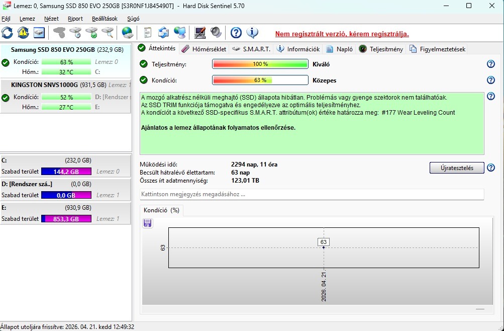 Eladó egy hibátlanul működő Samsung 850 EVO 250GB SSD. 100/63-as, és bár a HD Sentinel 63 napot ír becsült hátralévő időtartamnak, már egy jó ideje 100/63-on áll.