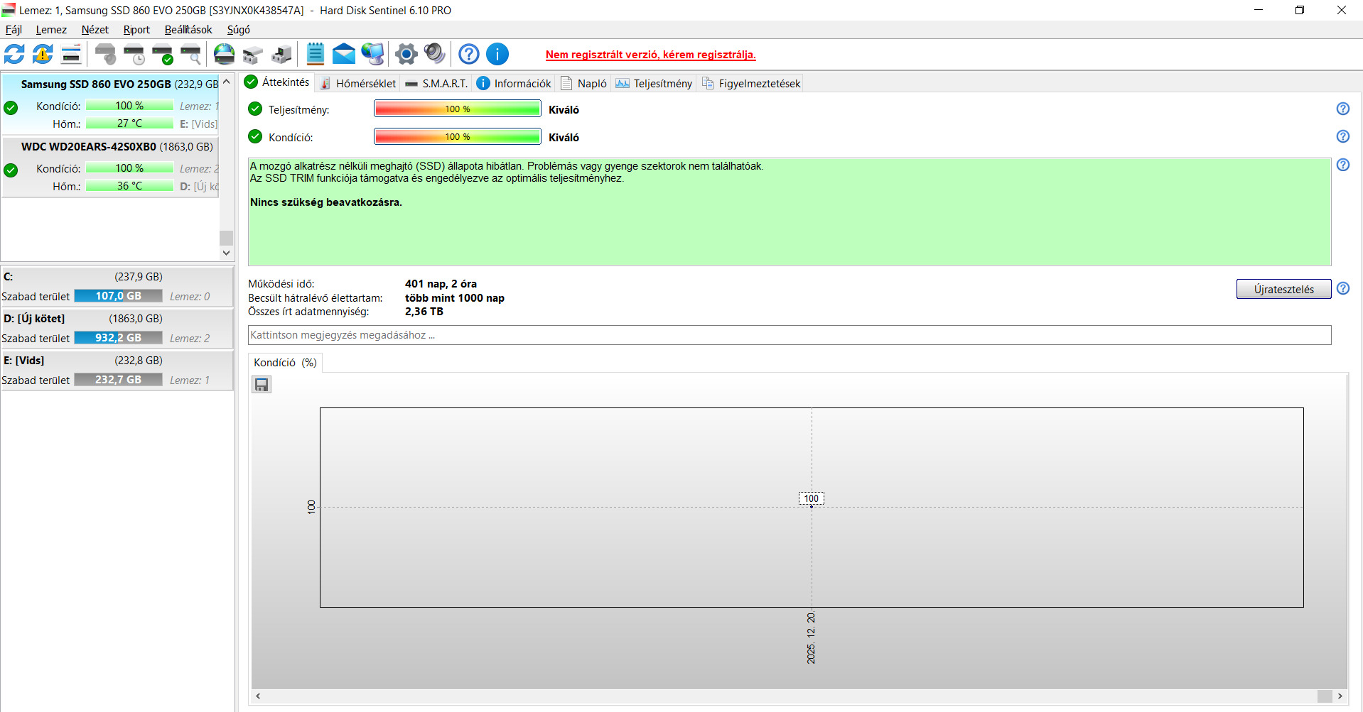 eladó a tárgyban szereplő SSD a képen látható állapotban, nem sokat használtam, csak tároltam rajta fileokat. 401 nap és 2 óra működési idő, 100/100-as állapot. 2,36TB írt adat összesen!!