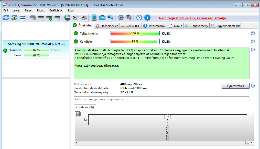 Eladó Samsung 860 EVO 250GB 100%/97% teljesítmény/kondícióval, összesen 400 nap működési idővel. Jár hozzá egy hét próbagarancia.