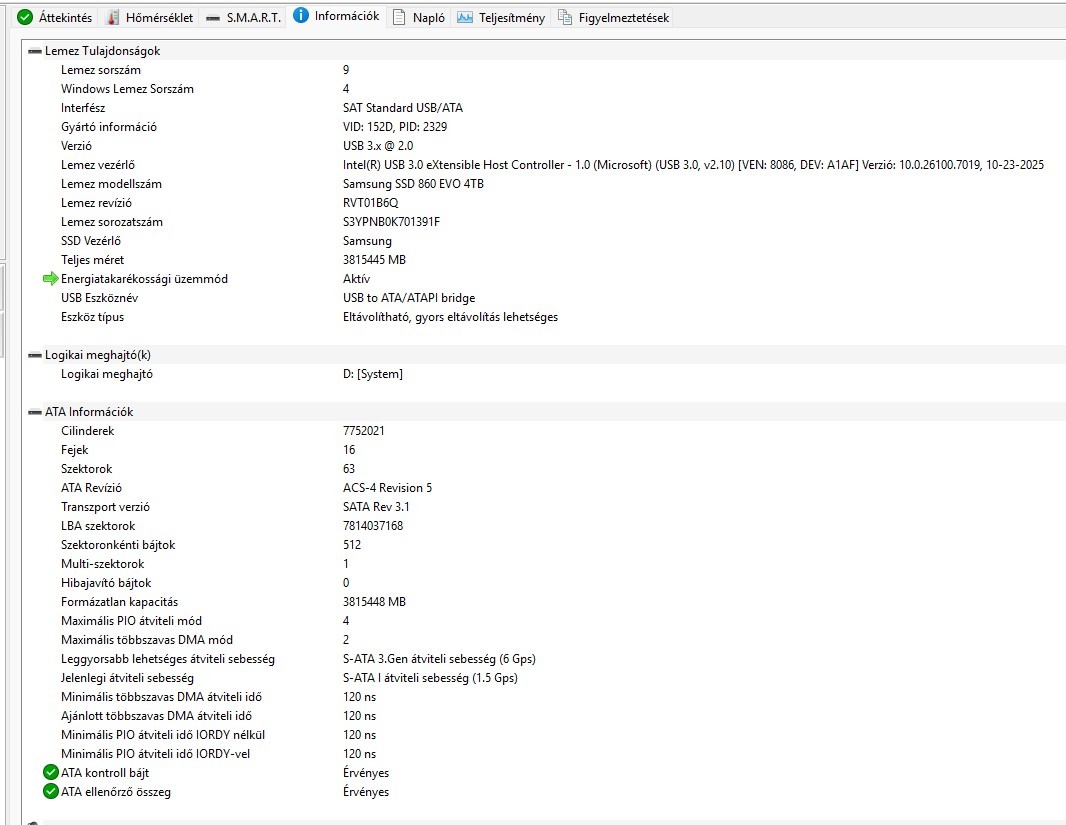 Samsung 860 EVO 4TB SSD, 1577 nap üzemidő, 100%-os kondíció, S.M.A.R.T. diag. rendben.
