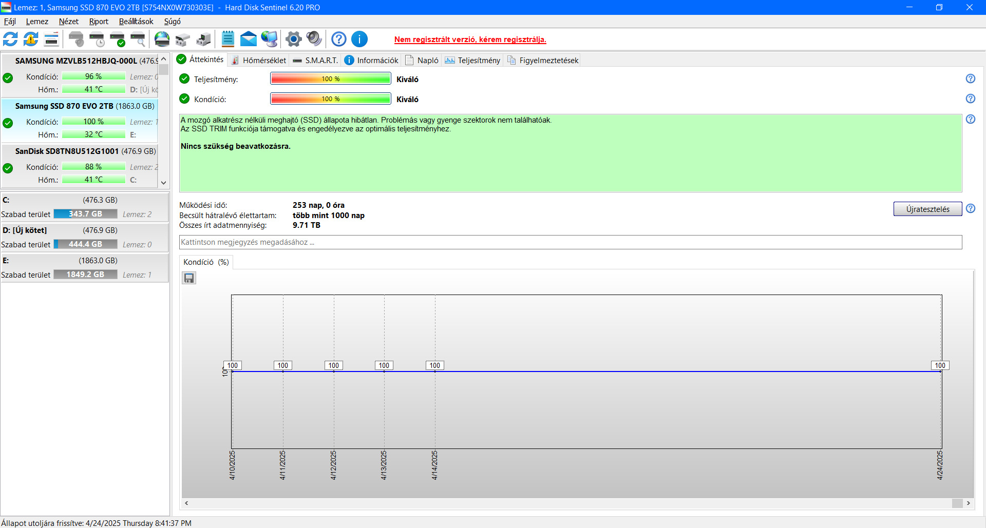 Samsung 2TB SSD eladó, képen mellékelve egy HD Sentineles állapotelemzés.