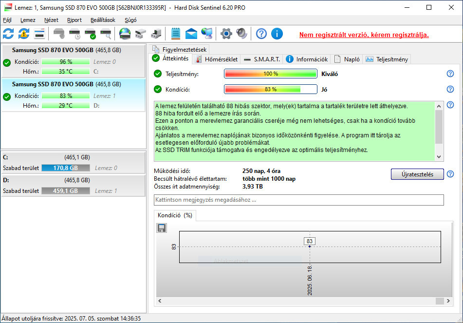 A HDSentinel szerinti állapot a képen látható.