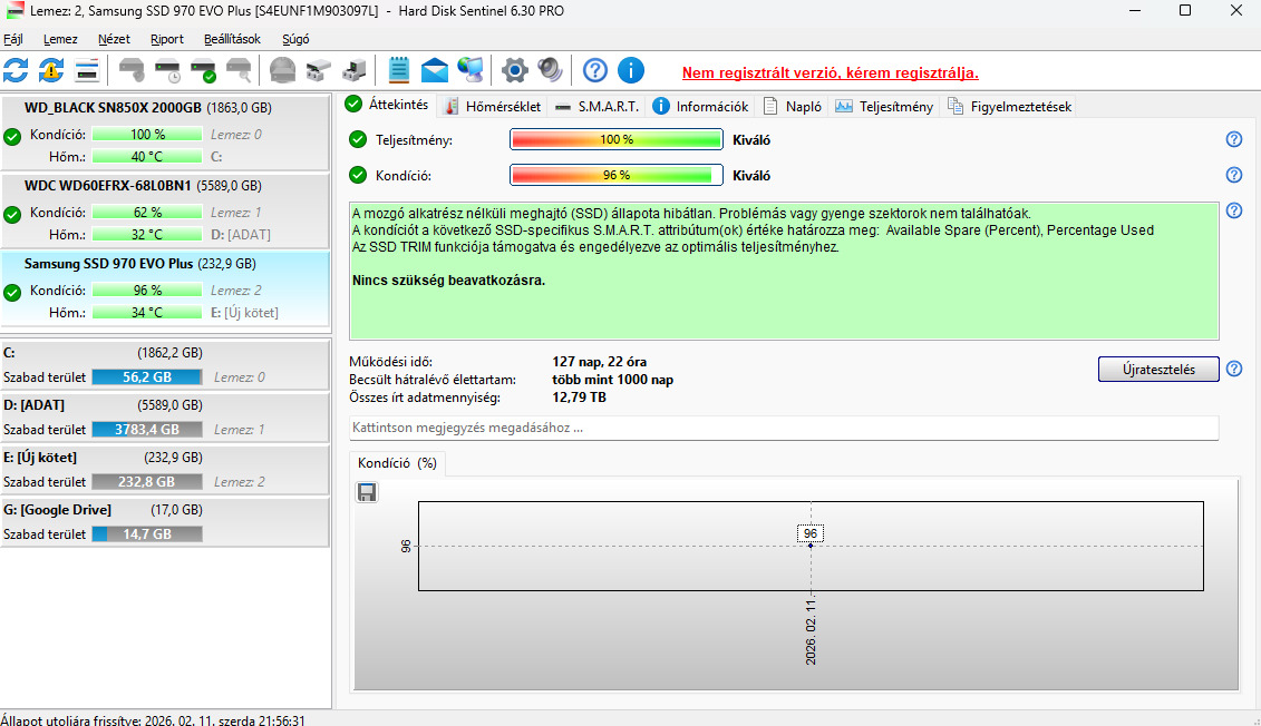 Eladó egy használt Samsung 970 EVO Plus 250GB SSD. A teljesítmény 100%, kondició 96%. Az SSD tökéletesen működik.