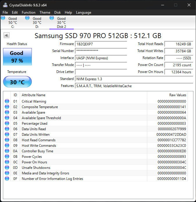 - Crystal Disk Info kép csatolva az SSD állapotáról