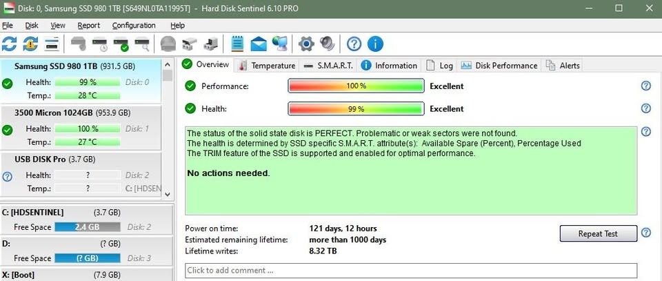 Sentinel kép csatolva, 99% kondíció, 121 nap működési idő és 8Tb írt adat.