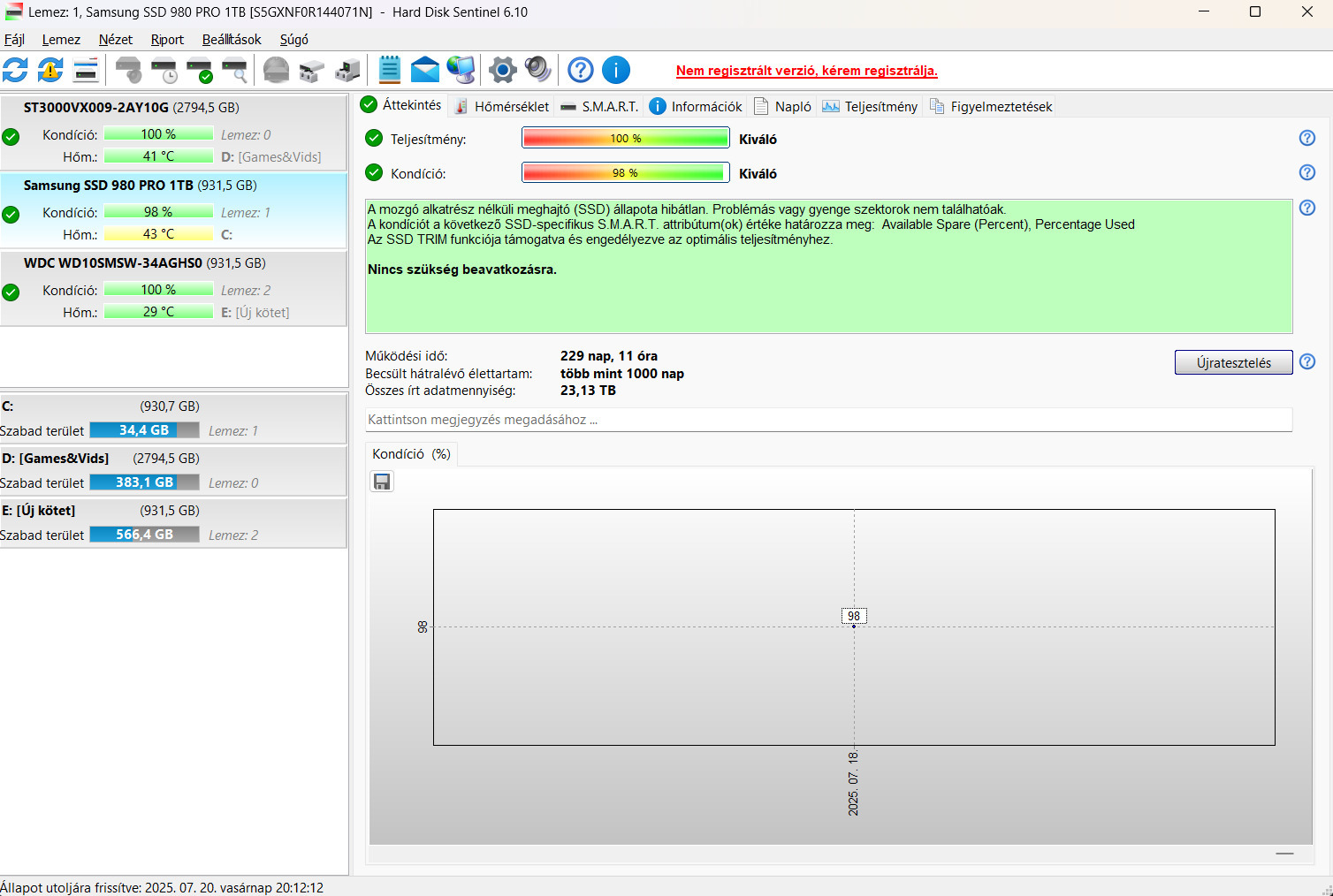 230 nap üzemidővel rendelkezik, 100%-os teljesítmény és 98%-os kondíció.