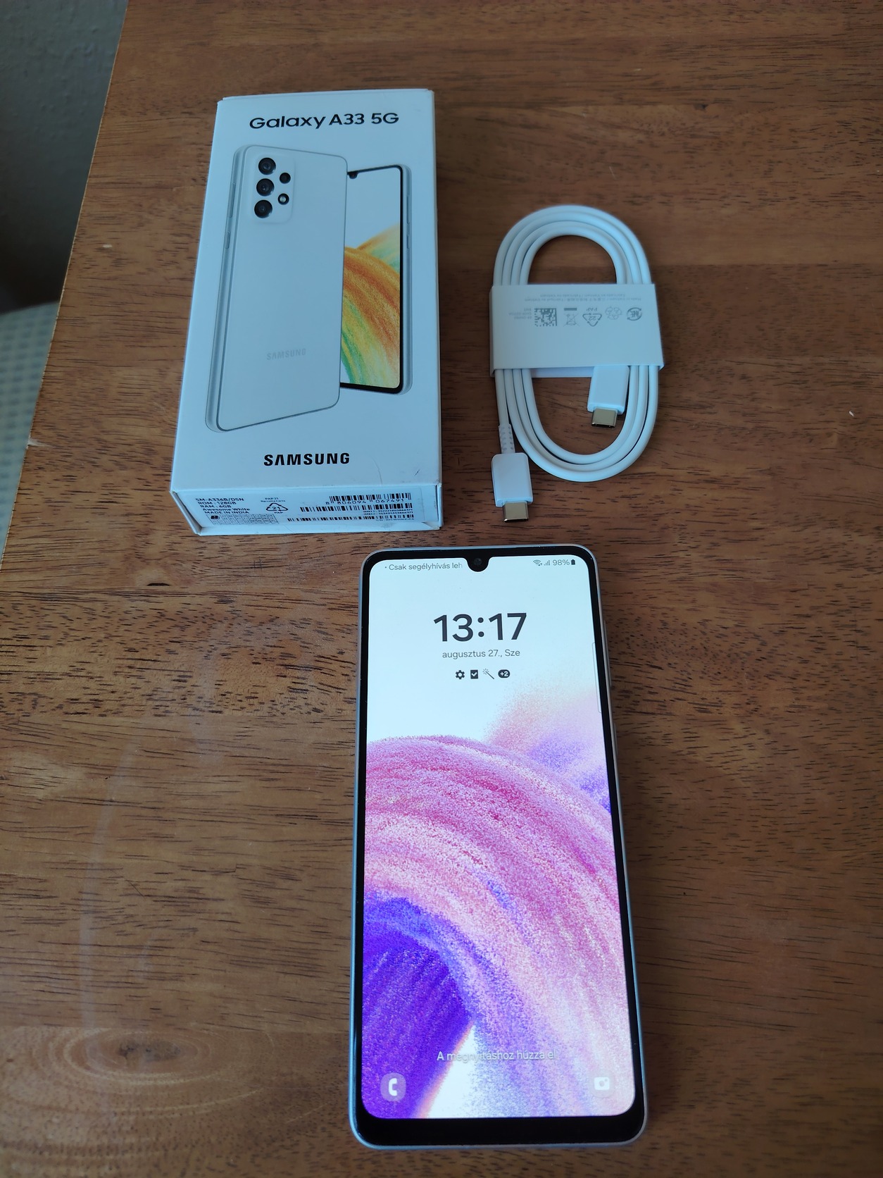 Eladó egy szinte új állapotú,fehér színű Samsung A33 5G tipusú,dual simes tehát két kártyás,független okos telefon. Mivel szinte karcmentes így akár ajándéknak is ajánlanám.Adom hozzá dobozát,gyári töltő kábelét,sim tűt. Aki nem ismerné egy pár szó a telóról,8 magos,6 giga ram,128 giga belső memória ami bővíthető,6,4 colos amoled kijelző,előlapi kamera 13 mpx,hátsó kamerák száma 4 egyenként,48,8,5,2 megásak,5000-es erős aksi,ujjlenyomatolvasó,5G támogatás,cseppálló,vízálló,porálló,dual sim. Kérdezz bátran ha komolyan érdekel mert több helyen is hirdetem,és ennyiért gyári tartozékokkal,ilyen állapotban nem hiszem hogy kapsz. Posta utánvéttel is megoldható,de annak a költségét előre kérem utalni!