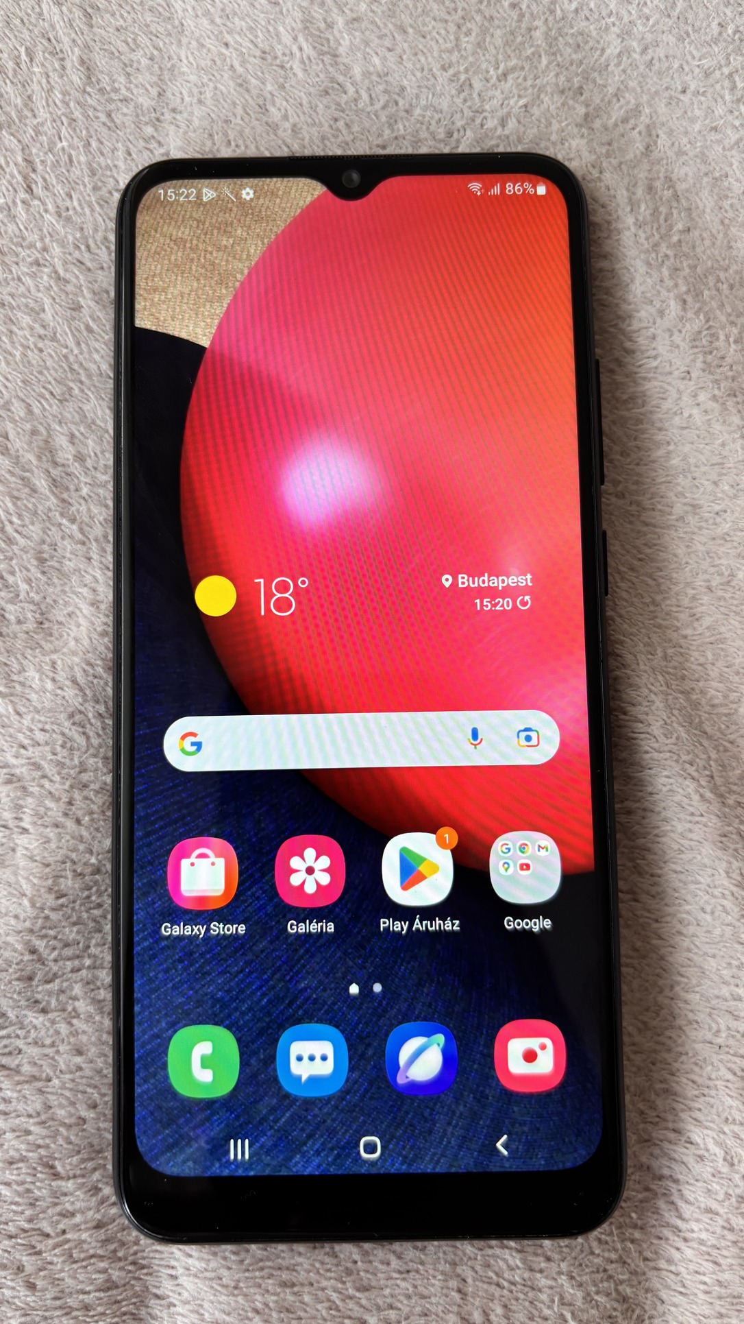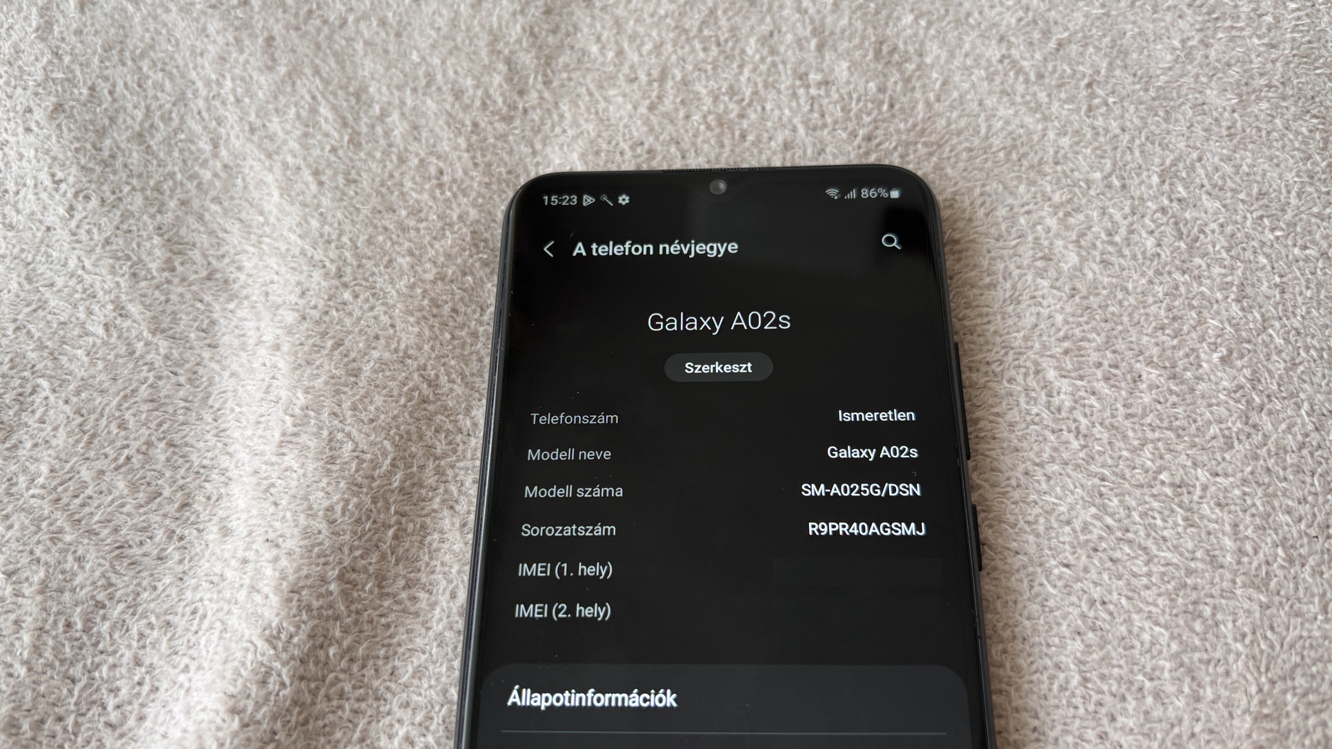 Eladó Samsung Galaxy A02s 32GB-os dual simes, fekete színű telefon, a képeken látható állapotban.
