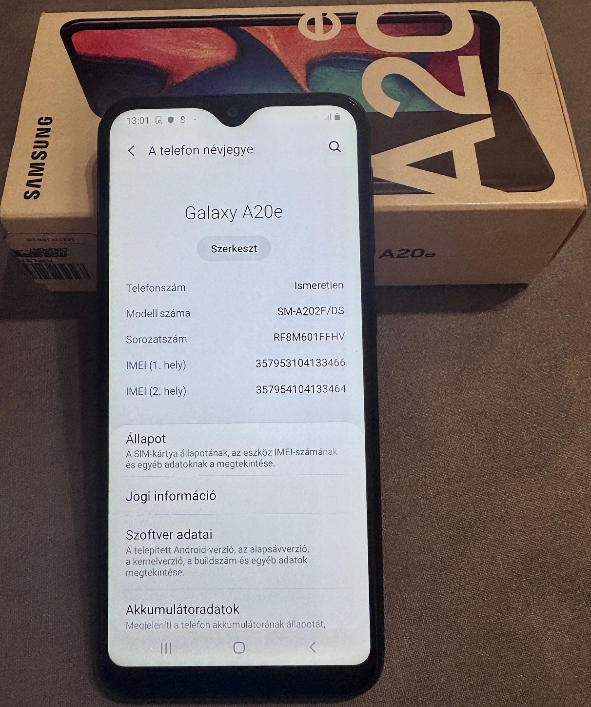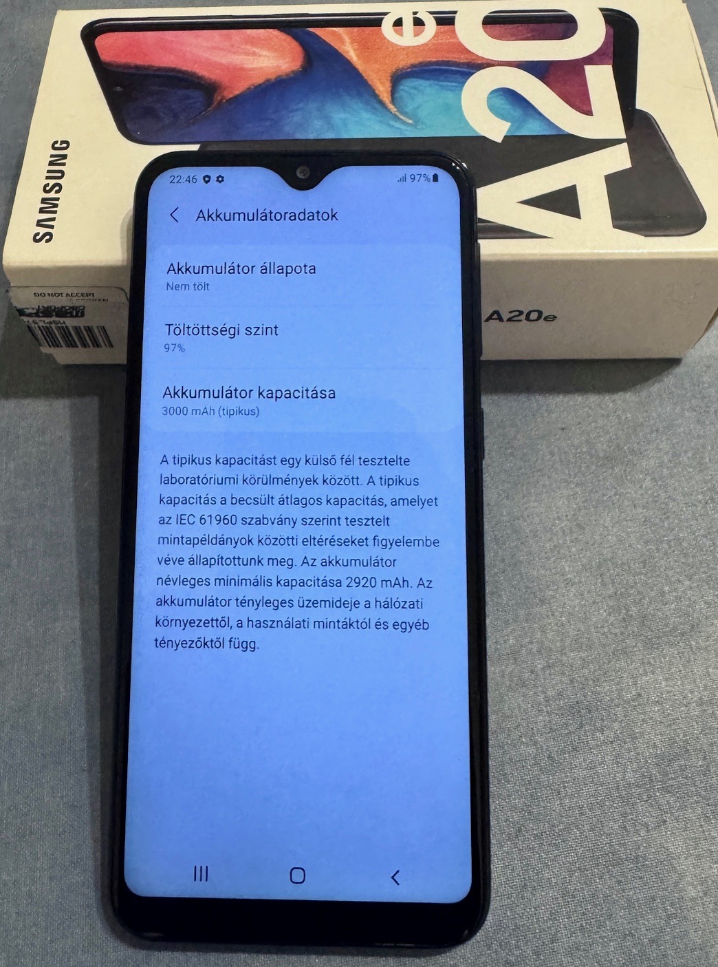 Samsung Galaxy A20e Black eladó gyári dobozban. SM-A202F/DS. Covid alatt vásárolt céges telefon amely a járvány után irodai belső használatra használtak, a készülék az elmúlt években tartalékként volt jelen az irodában, rendszeres töltés volt, nincsen baj az akkumlátorral. Egyáltalán nincsen túlhasználva, hiszen belső telefonás volt eddig az alap funkciója. Kártyafüggetlen. Andorid 11 fut gyári állapotba állítva. Akkumulátor 3000 mAh.