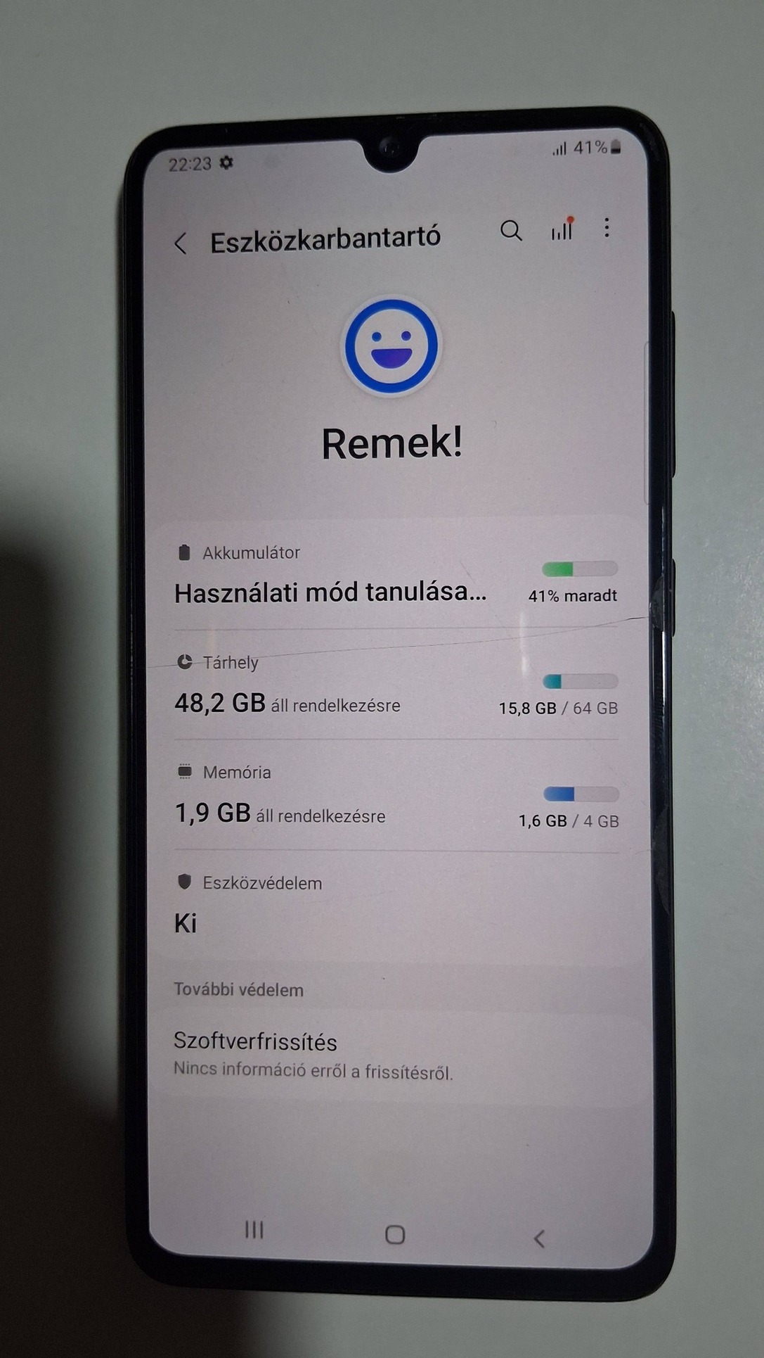 A kijelzön van egy hajszál repedés de a működését nem befoljásolja tökéletesen teszi a dolgát